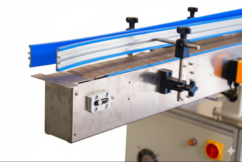 Ширина конвейерной линии может быть адаптирована под специфику тары заказчика для обеспечения максимальной устойчивости продукции при перемещении. В основе конструкции используется надежная цепь из полиацеталя (POM), обладающая низким коэффициентом трения и высокой износостойкостью.