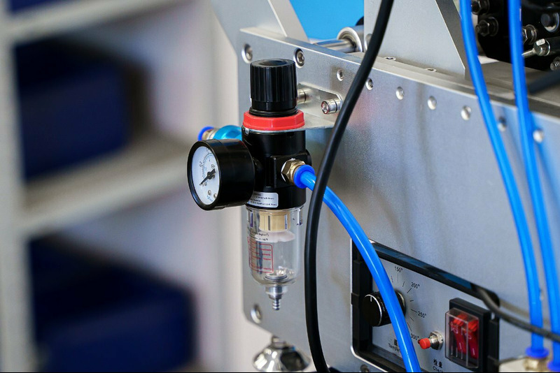 Пневматическая фиксация: Надежный прижим тары осуществляется с помощью пневмоцилиндра, расположенного сверху. Это гарантирует стабильное положение флакона в процессе этикетирования, исключает его проскальзывание и обеспечивает идеально ровное нанесение даже на легкую или скользкую тару.