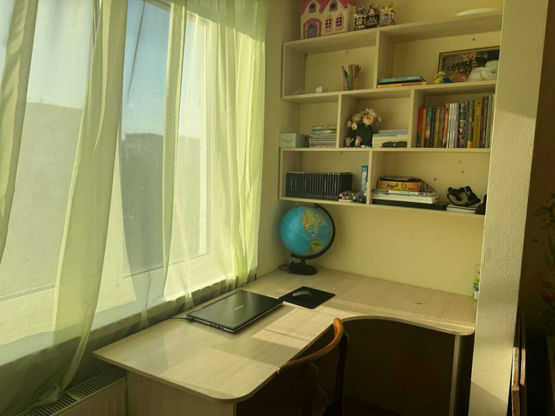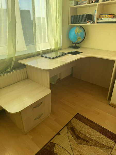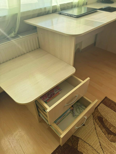 Продается комплект письменный стол+книжная полка. Размеры стола 195*110, сбоку удобное дополнительное место для сидения, выдвижные ящики для хранения. края закруглены, состояние идеальное. Книжная полка размеры 110*90*24.