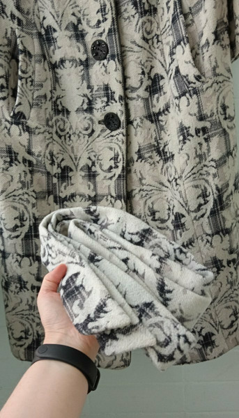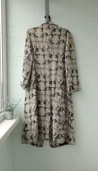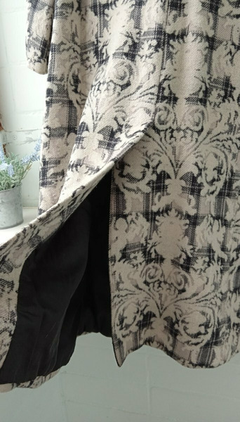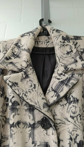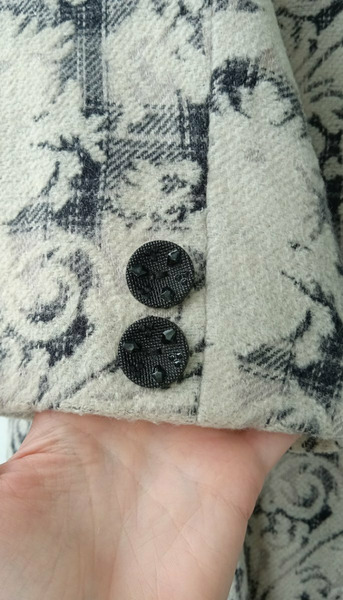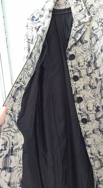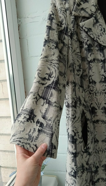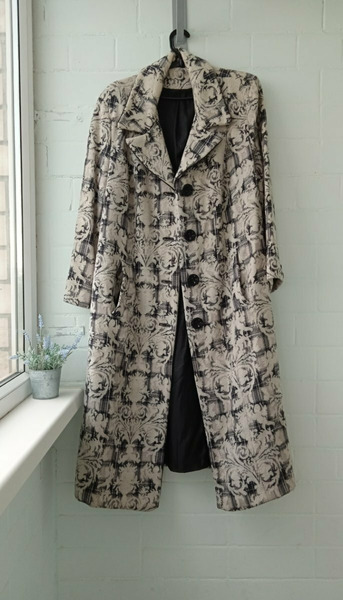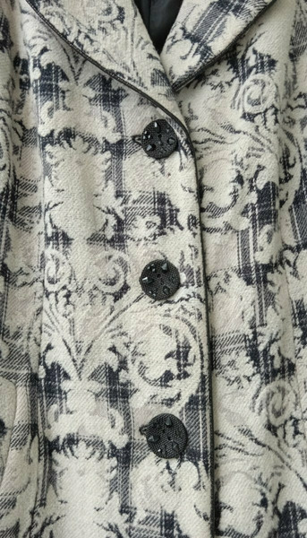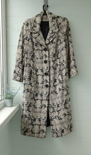 Пальто шерстяное женское 52-54 размера с необычными пуговицами и принтом в виде узоров. Сзади разрез (шлица). По бокам вместительные карманы. Состав: пальто женское шерсть 80% и 20% акрилик.